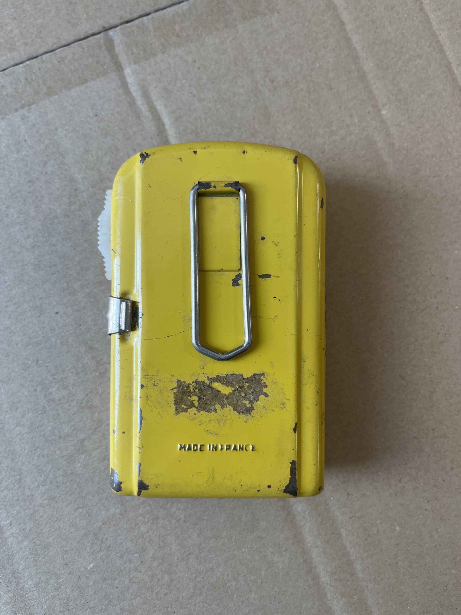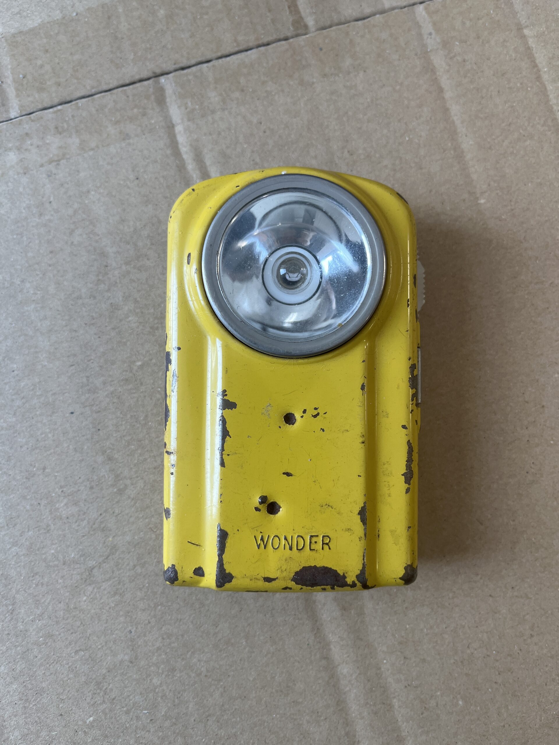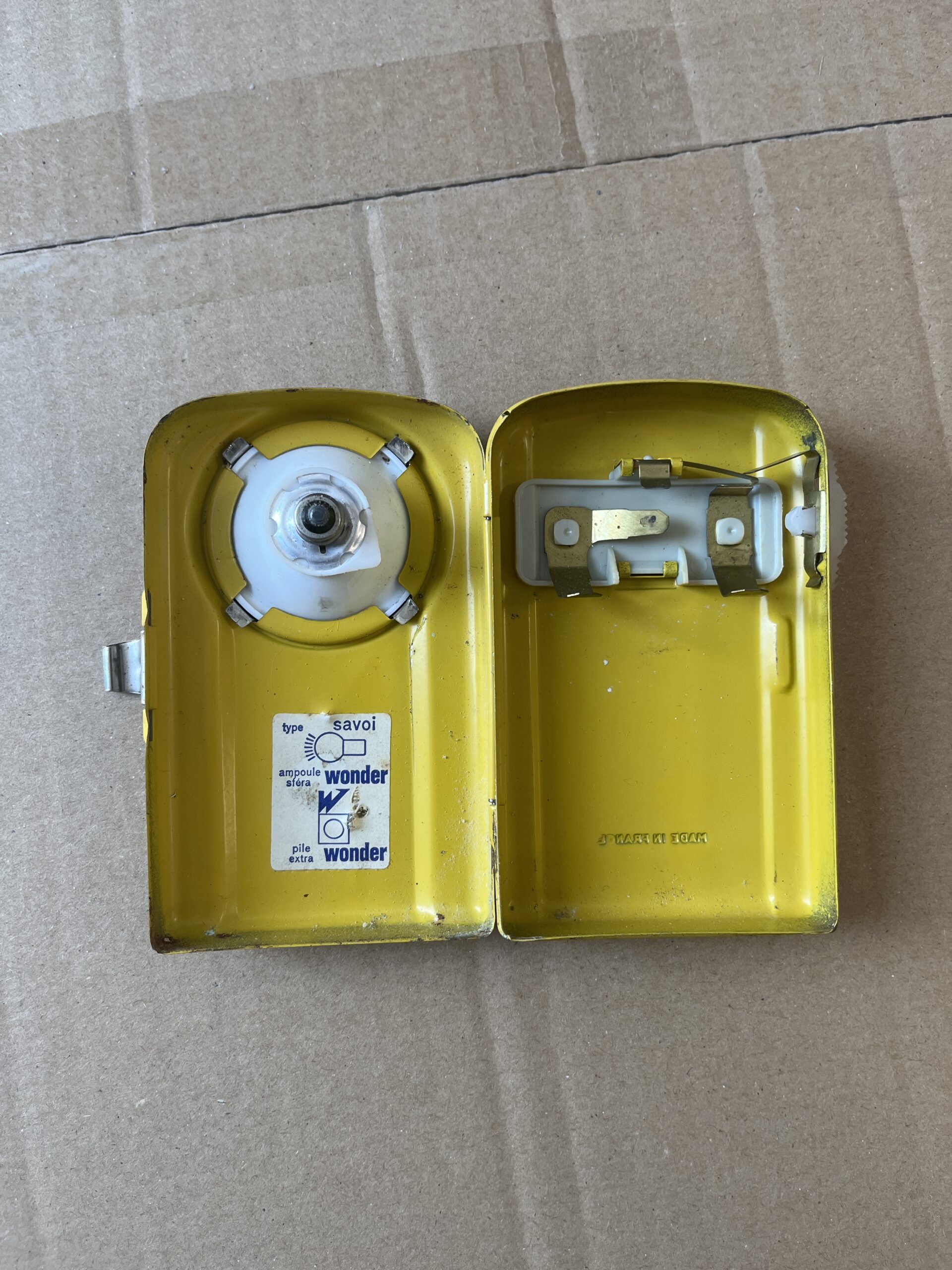 Vintage zaklamp van het merk Wonder, Frans fabricaat. Gele uitvoering. Deze zaklamp is heel veel gebruikt en verkeert in gebruikte staat. Een mooi verzamelobject voor liefhebbers van vintage lampen en Frans design.